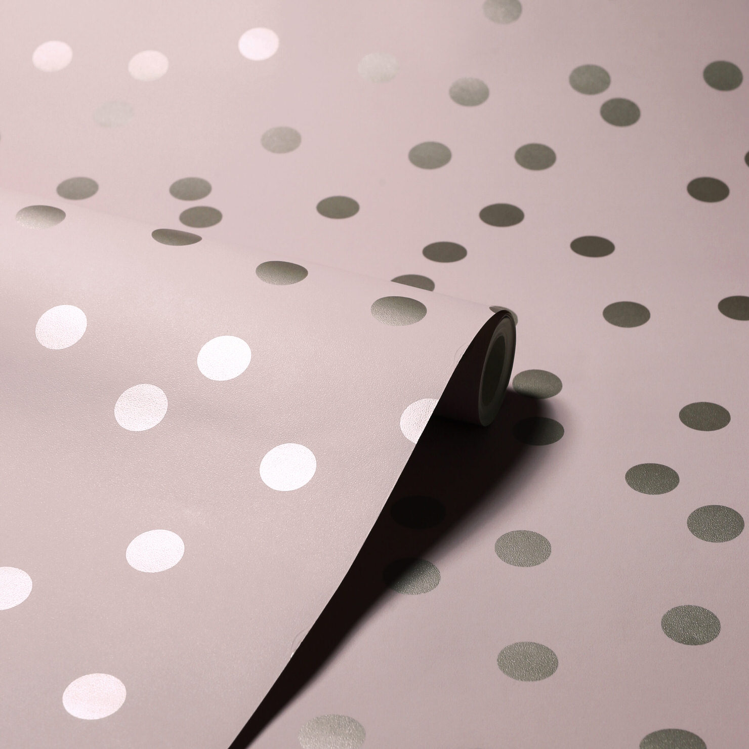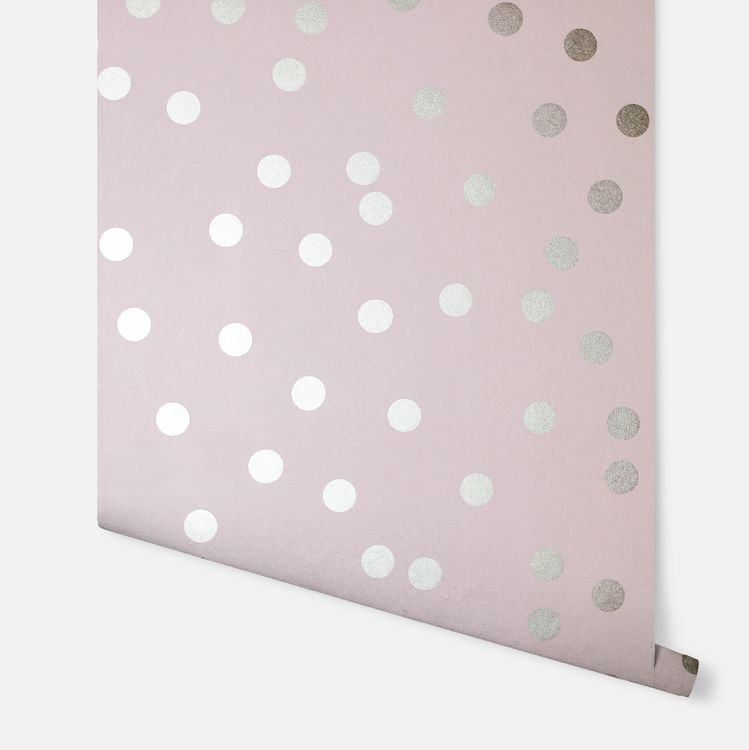 This pretty wallpaper comes in a matt blush pink background with contrasting rose gold polka dots that are enhanced with a metallic finish that catches the light which creates a beautiful atmosphere in the room.