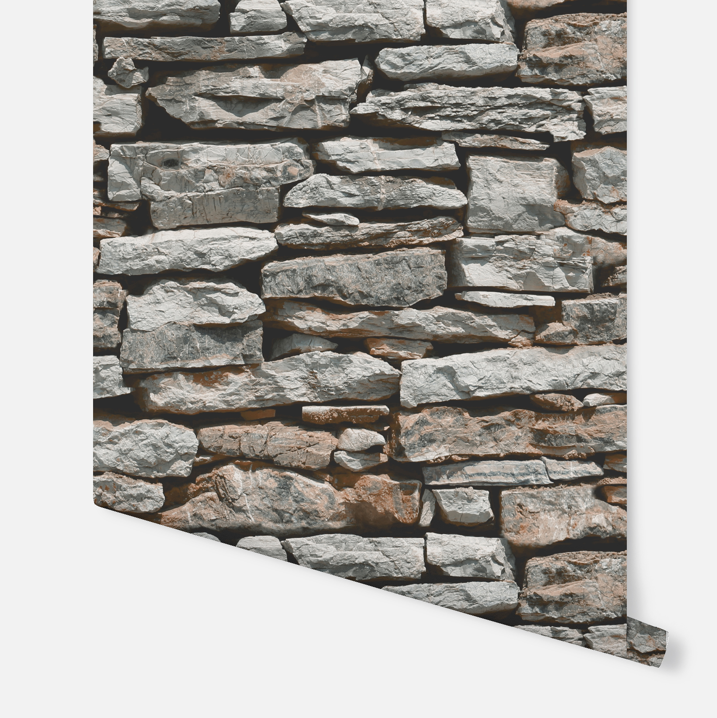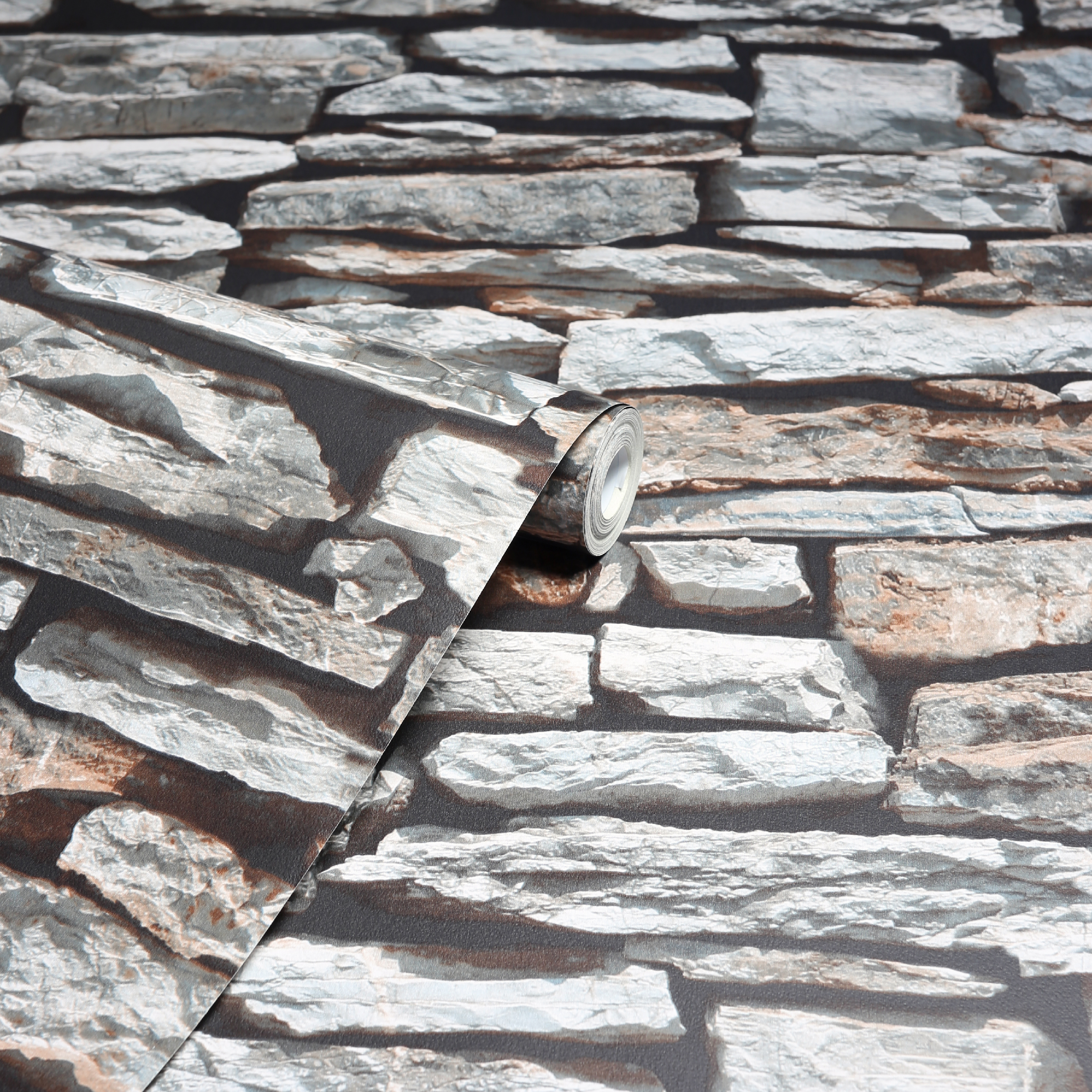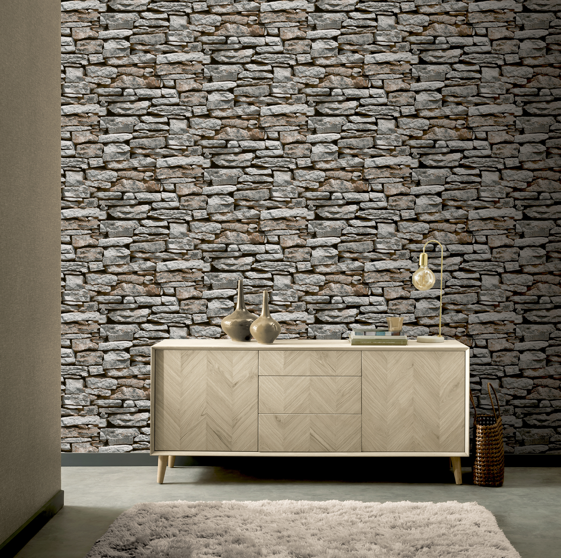 Featuring a grey stone effect, this wallpaper is well suited for use in modern homes and typically works well as a feature wall.