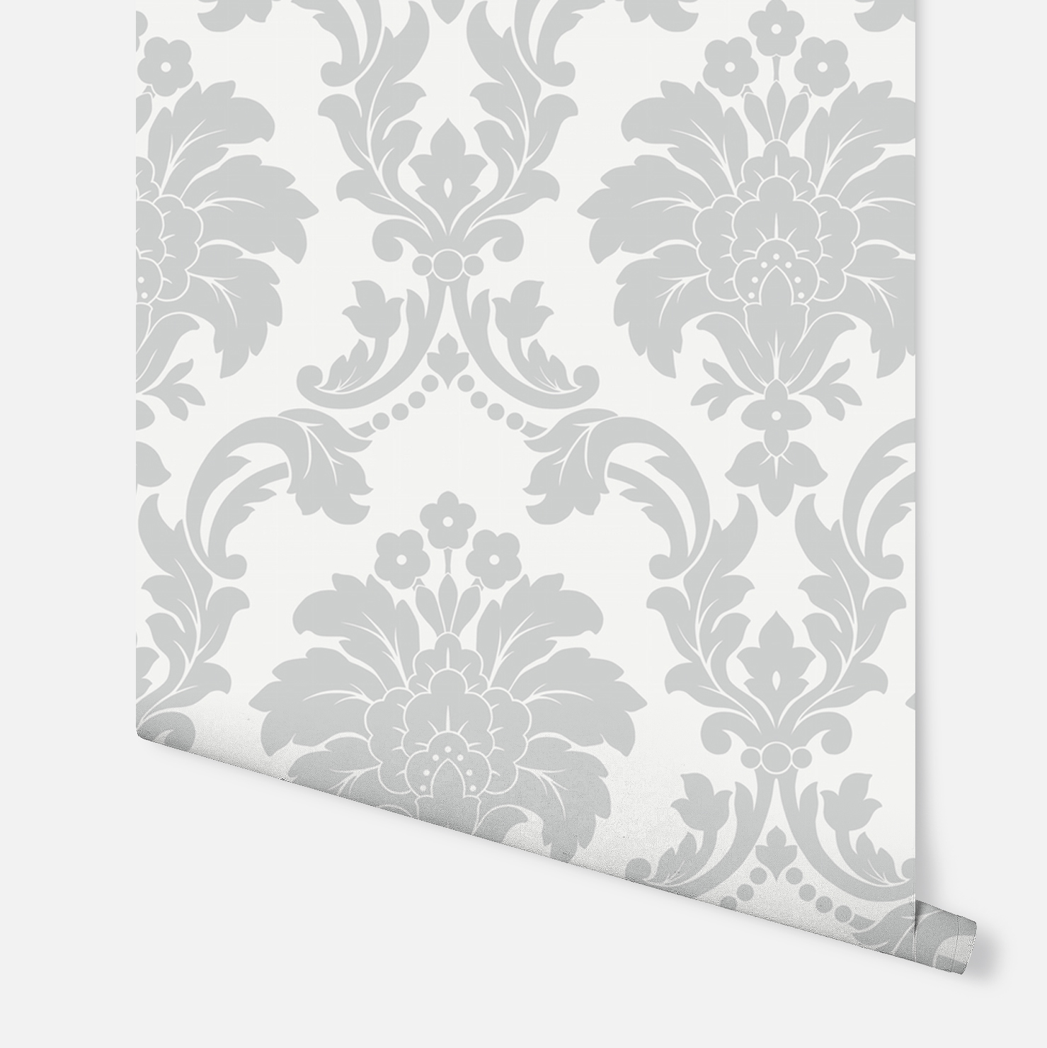 Featuring traditional floral damask pattern, this stunning wallpaper features a shimmering metallic background.