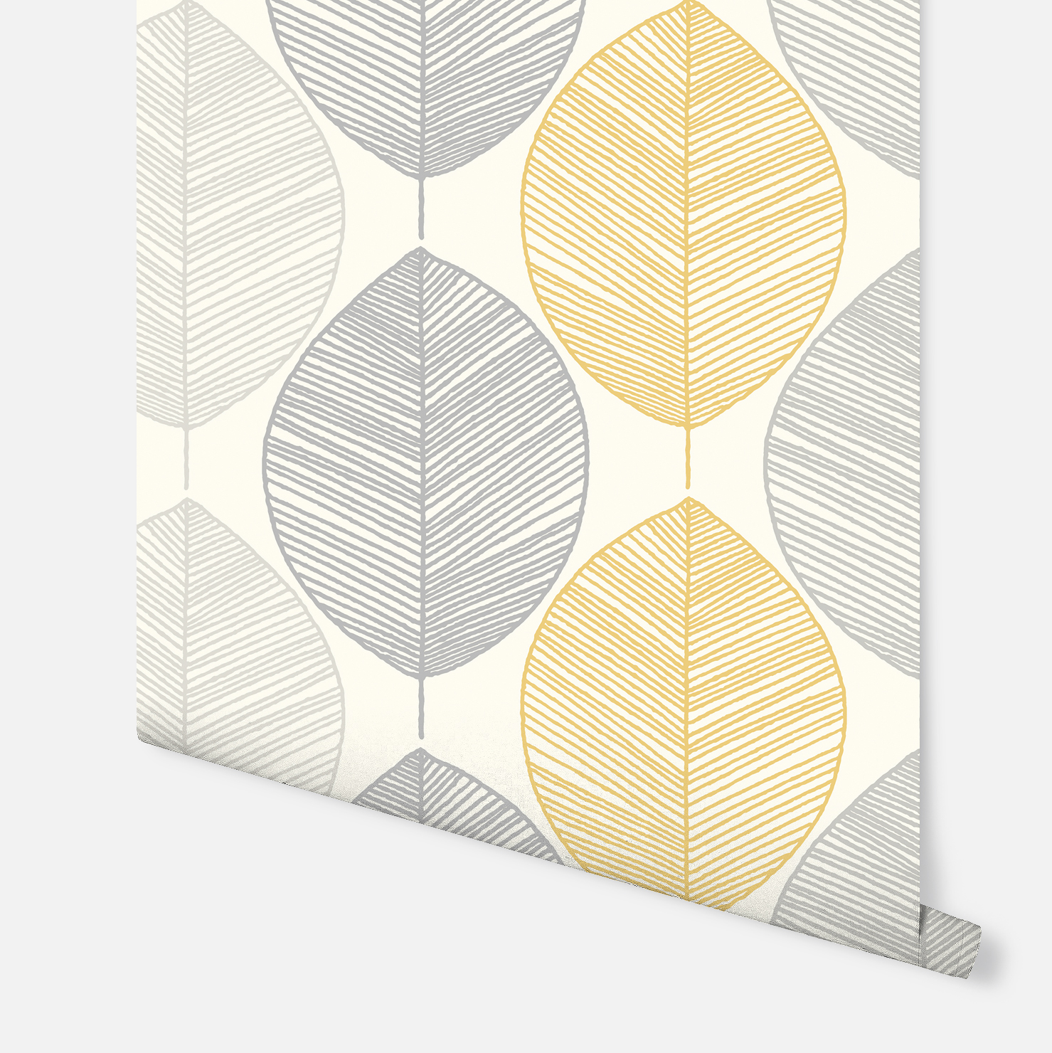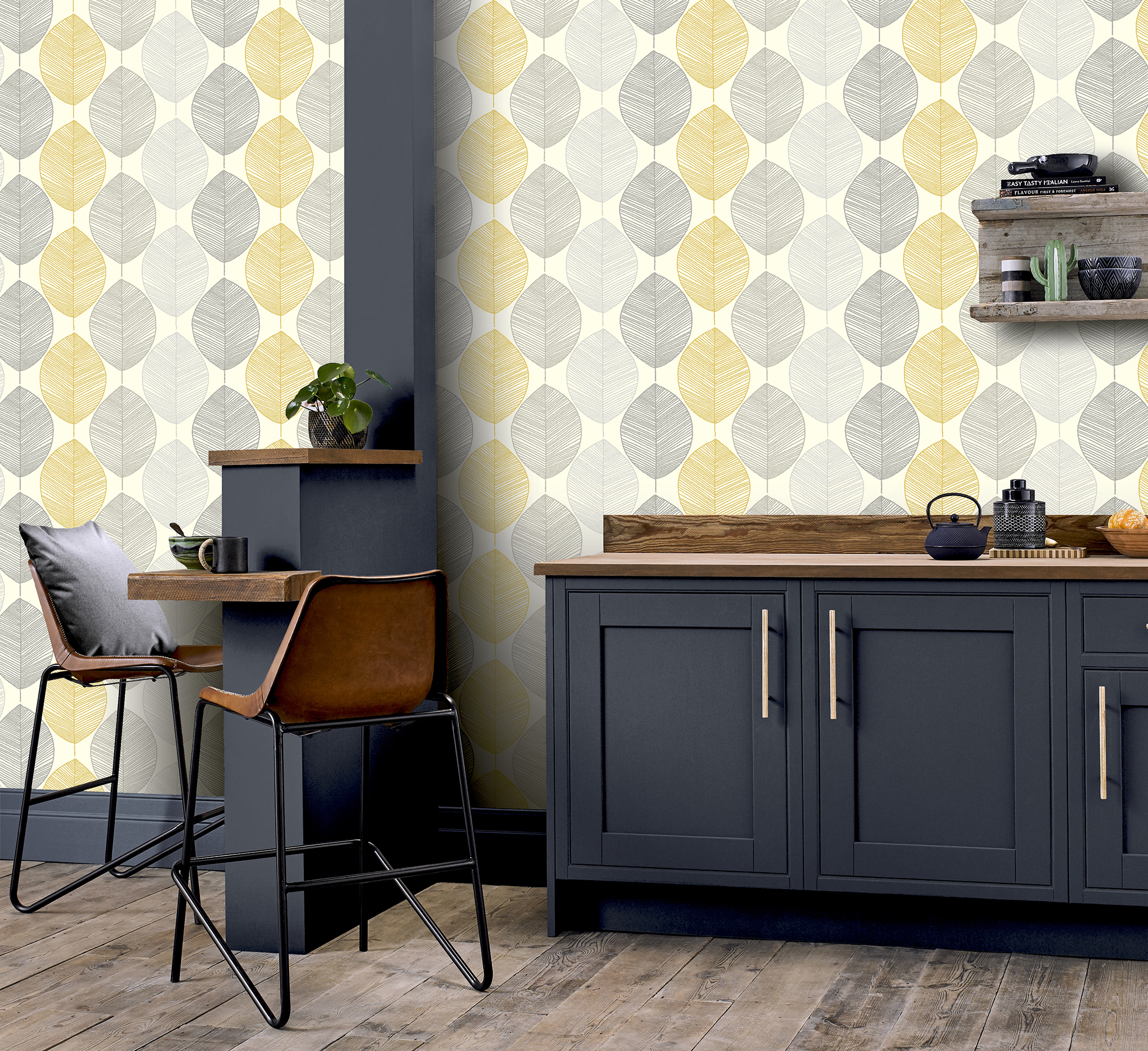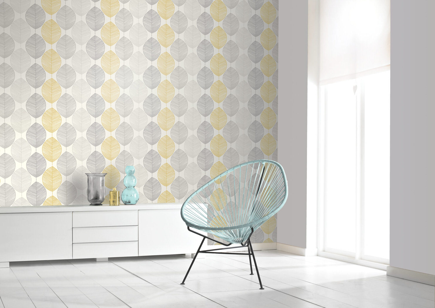 The wallpaper features a fun yet sophisticated leaf print which is brought to life in an on-trend yellow and grey colour scheme.