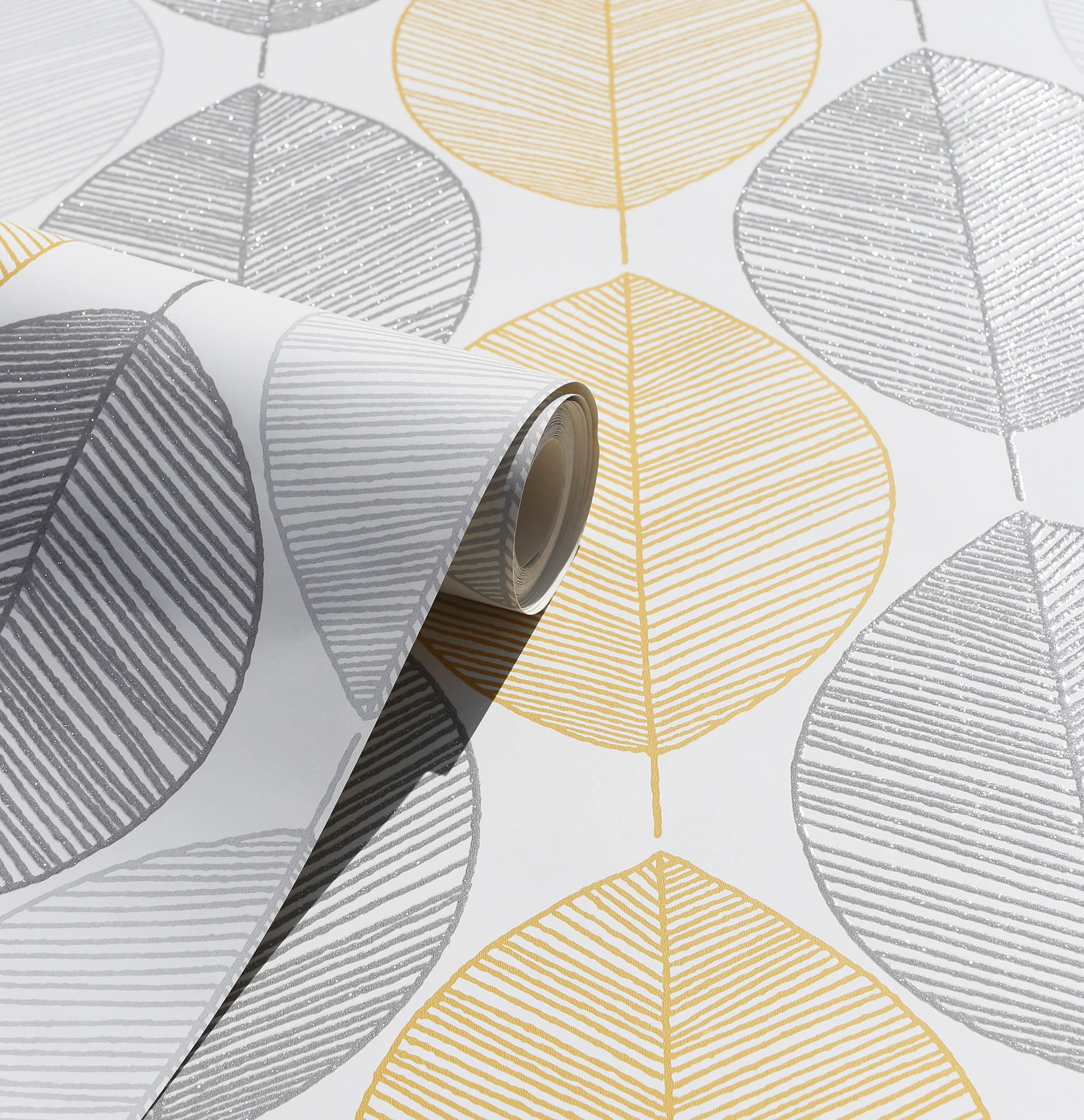 The Arthouse Scandi Leaf Yellow/Grey Glitter Wallpaper is specially designed to offer your home both character and colour this season.