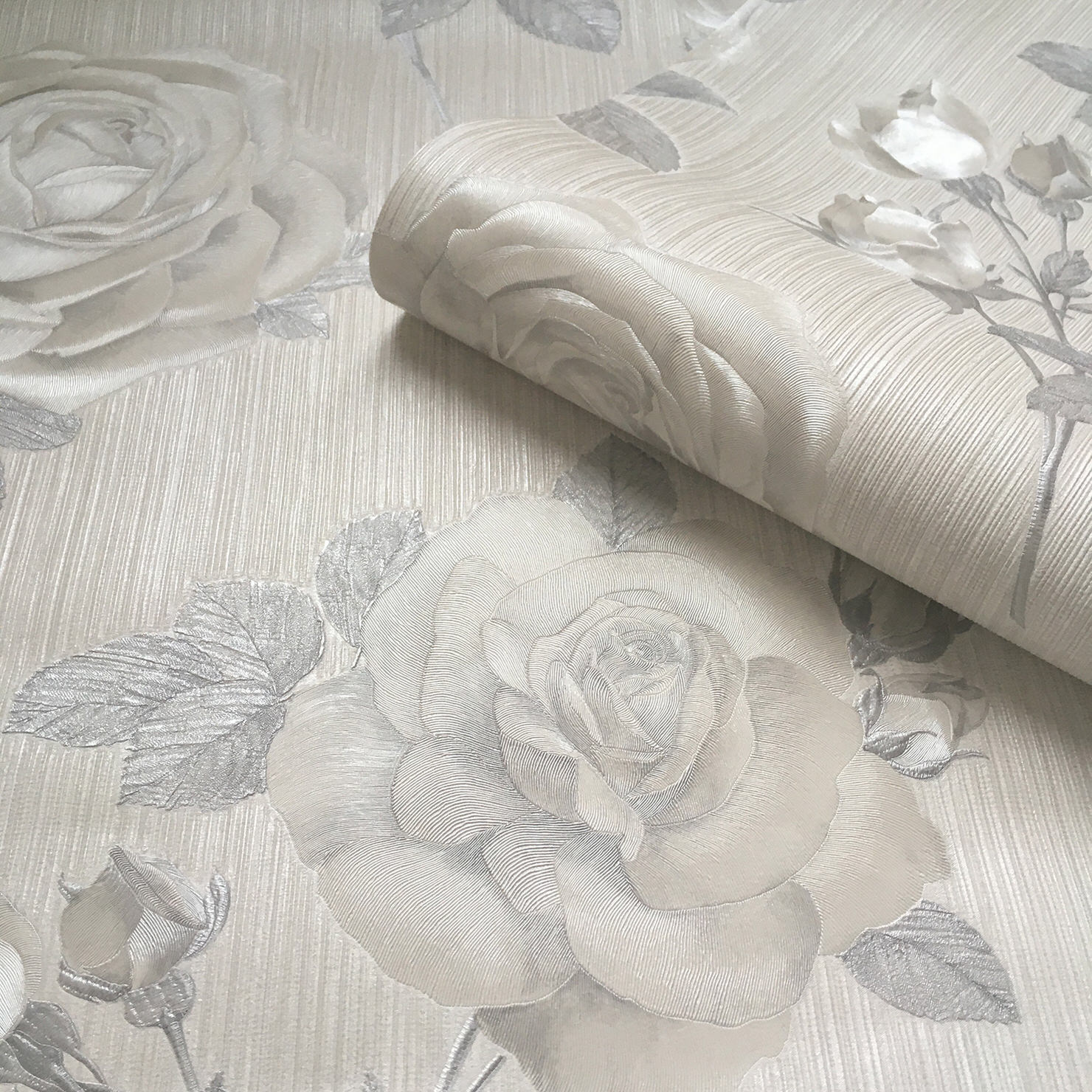 Heavyweight vinyl wallpaper from Belgravia Decor’s Amara Collection. Classic vintage large scale rose design. Perfect for adding a delicate vintage feel to all your living areas. Product Highlights Durable, Italian solid vinyl wallpaper Indulgent, high relief decorative rose floral design. Neutral shimmer with soft pink floral shades. Simple to hang. Easy to maintain, scrubbable finish.