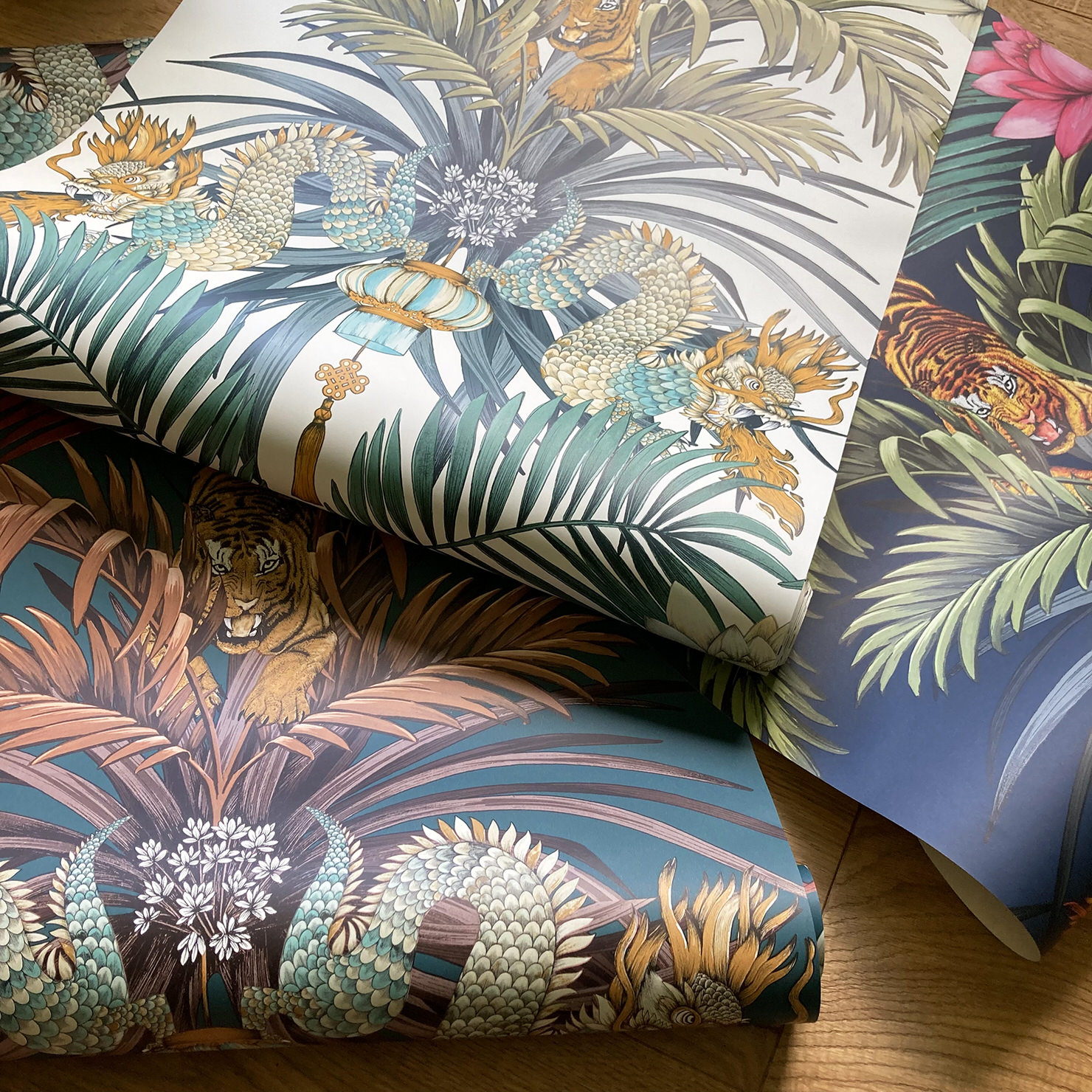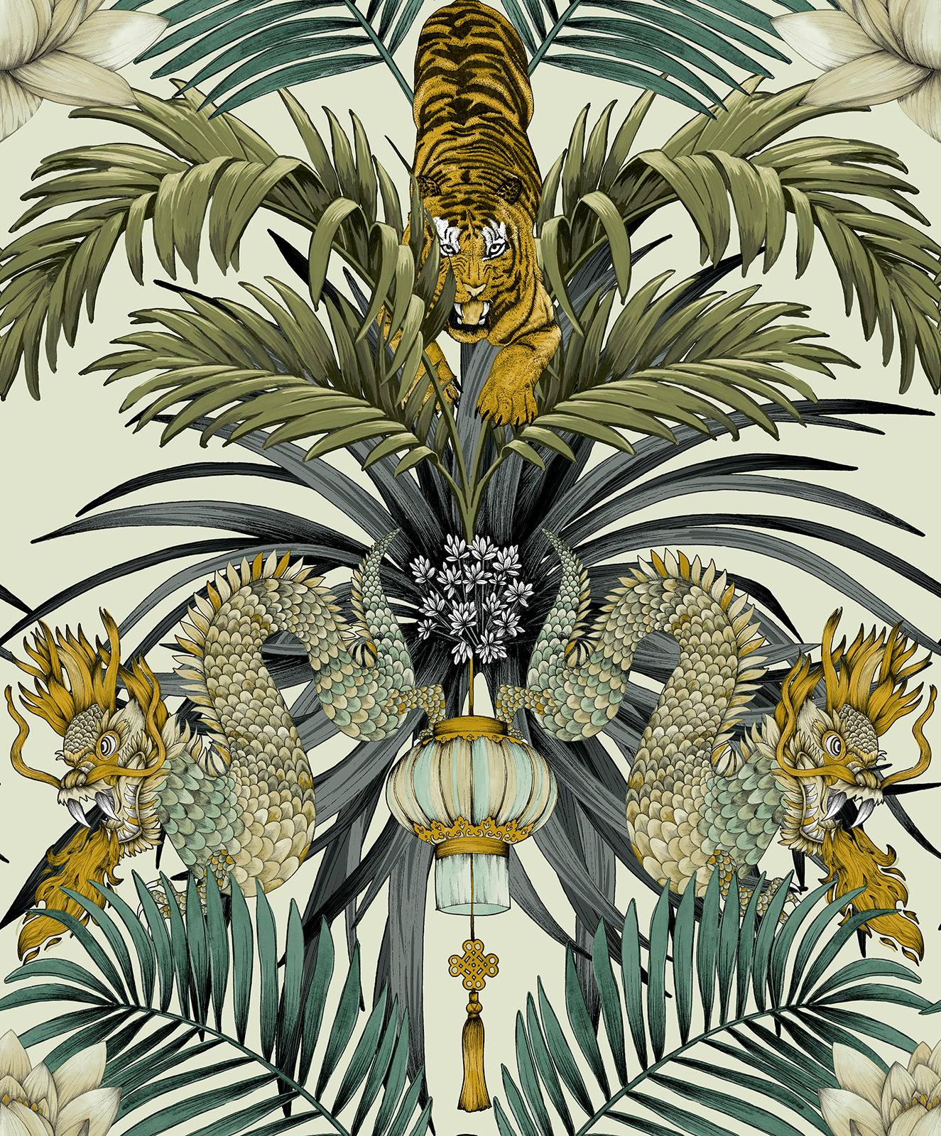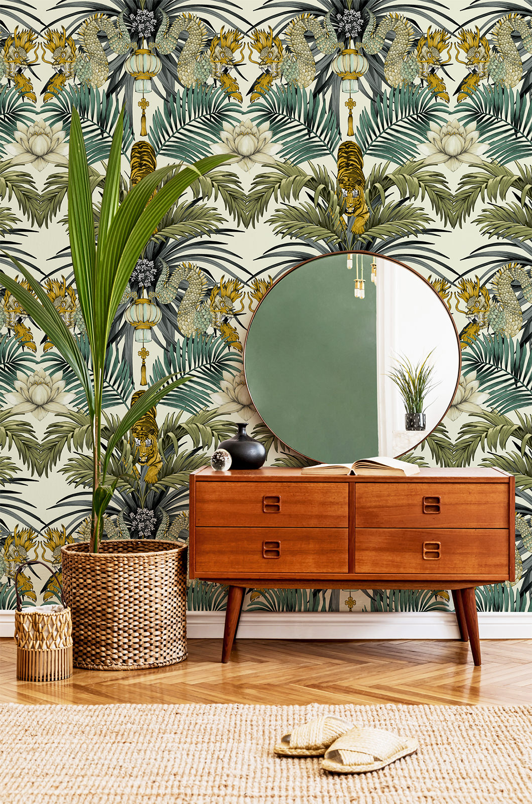 Richly toned and striking, the Belgravia Decor Wilson Oriental Tiger Metallic Wallpaper will surely take your interiors to the next level. Featuring a bold print of a roaring tiger and fire-breathing dragons atop tropical palm leaves and a setting, this metallic wallpaper is sure to turn heads in any room. This flat wallpaper will blend well with contemporary furniture. Use the Belgravia Decor Wilson Oriental Tiger Metallic Wallpaper to create an eye-catching statement for your space. Whether you?re looking for a vibrant style for your living room, or for a stunning accent piece in your bedroom, this tiger wallpaper does it all.