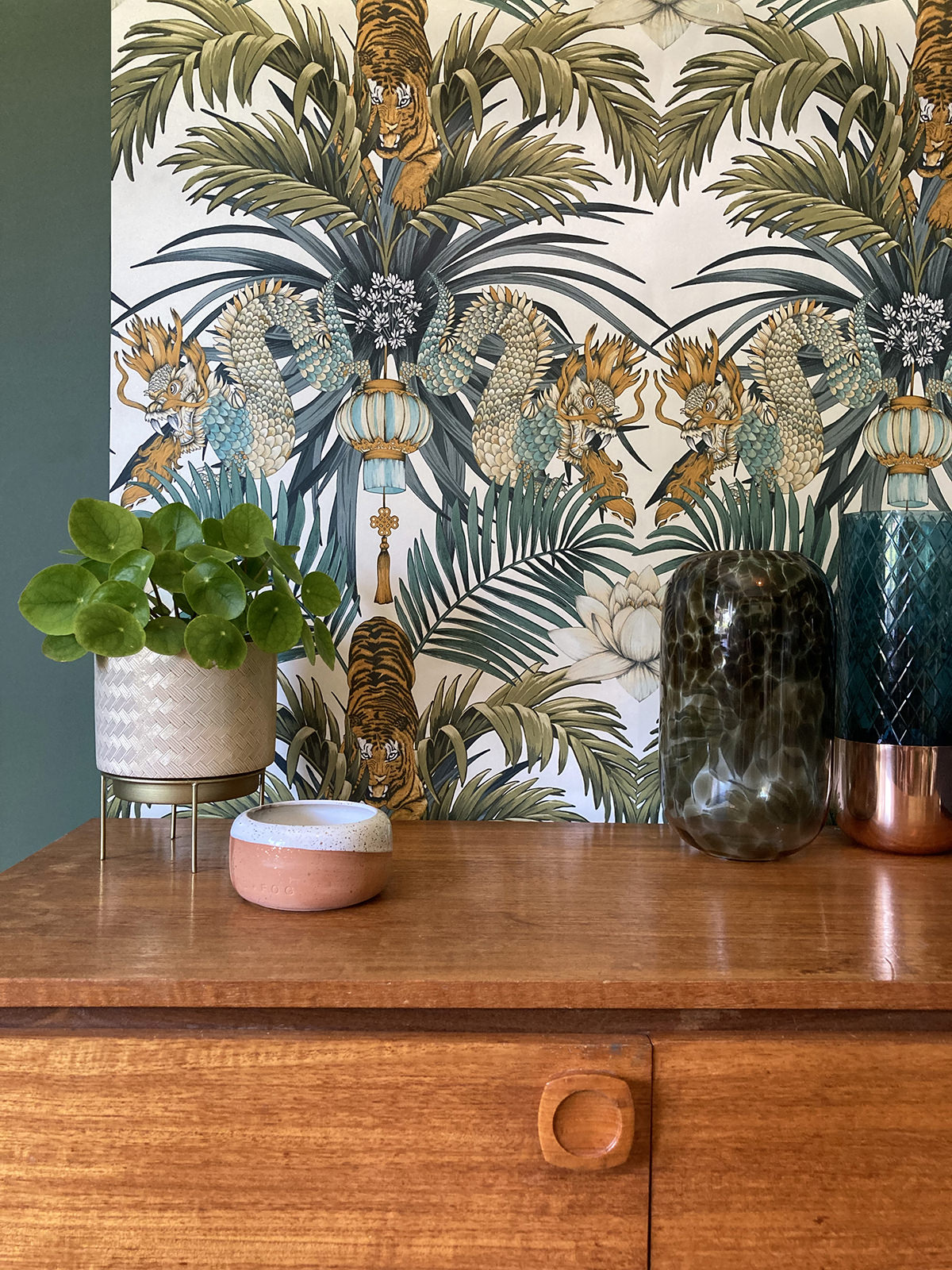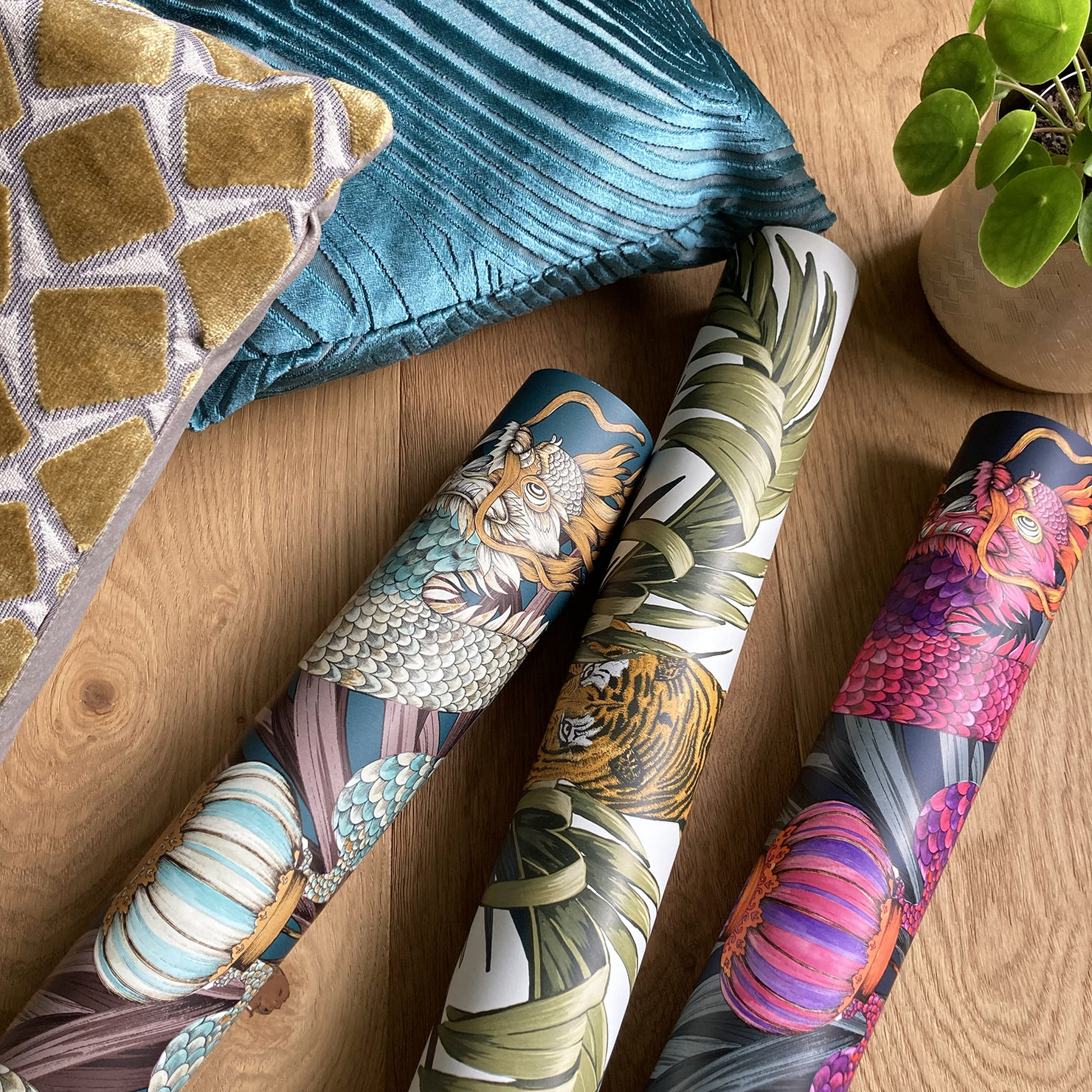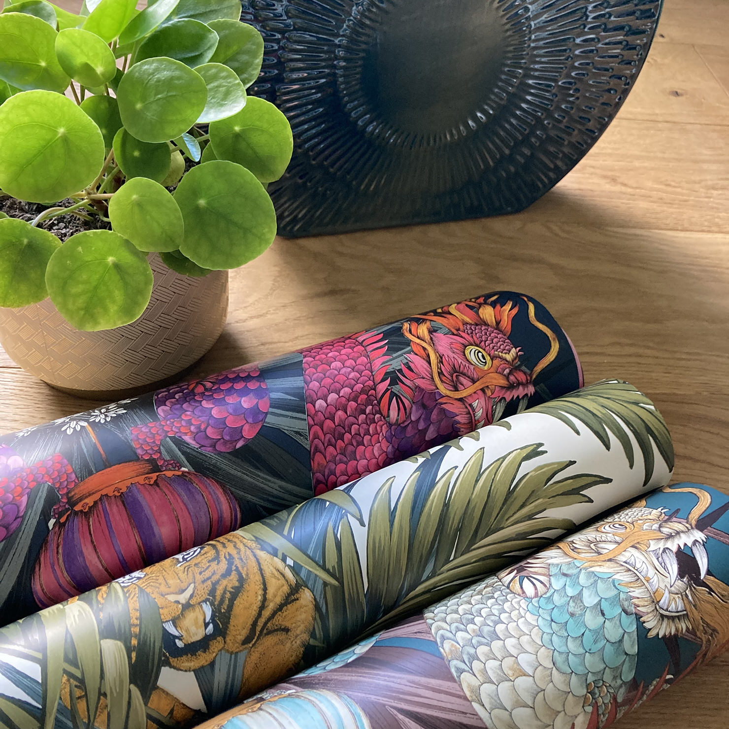 Richly toned and striking, the Belgravia Decor Wilson Oriental Tiger Metallic Wallpaper will surely take your interiors to the next level. Featuring a bold print of a roaring tiger and fire-breathing dragons atop tropical palm leaves and a setting, this metallic wallpaper is sure to turn heads in any room. This flat wallpaper will blend well with contemporary furniture. Use the Belgravia Decor Wilson Oriental Tiger Metallic Wallpaper to create an eye-catching statement for your space. Whether you?re looking for a vibrant style for your living room, or for a stunning accent piece in your bedroom, this tiger wallpaper does it all.