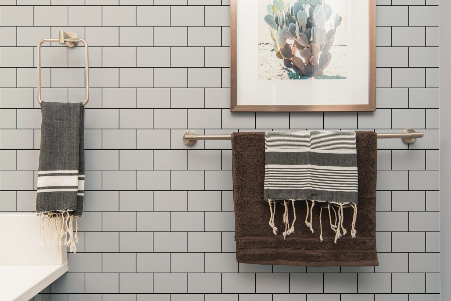 The design is reminiscent of traditional white ceramic tiles found in the subway or underground and features a high gloss finish and embossed matte black grouting.