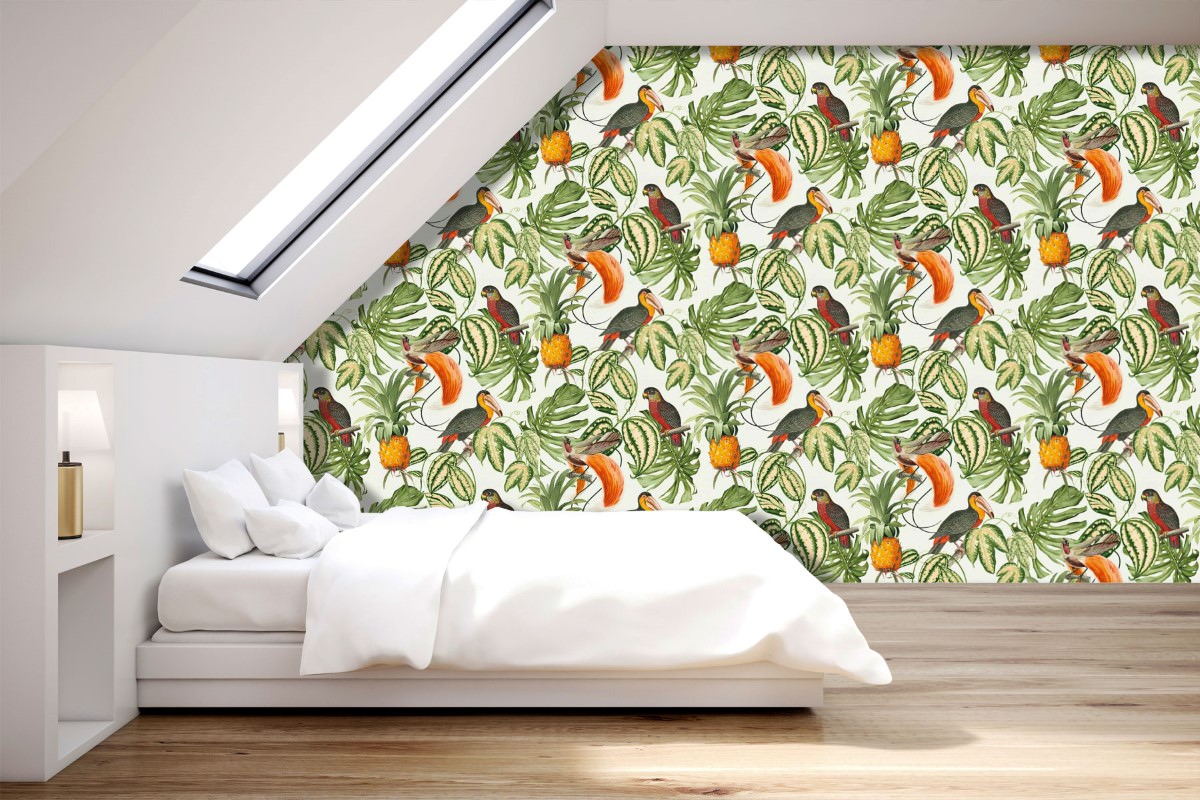 This modern wallpaper features rainforest jungle scene pattern, with a variety of tropical birds perched on the trees and leaves.