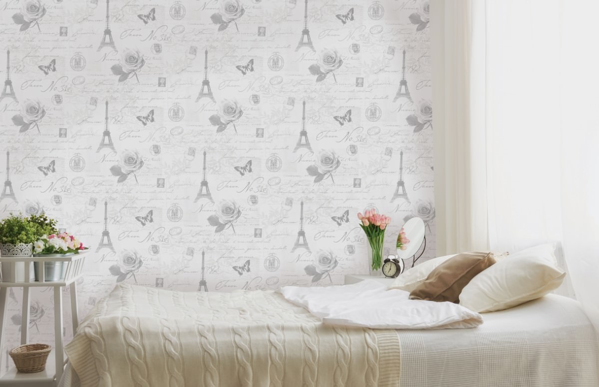 The wallpaper features a Parisian inspired design with stunning calligraphy.