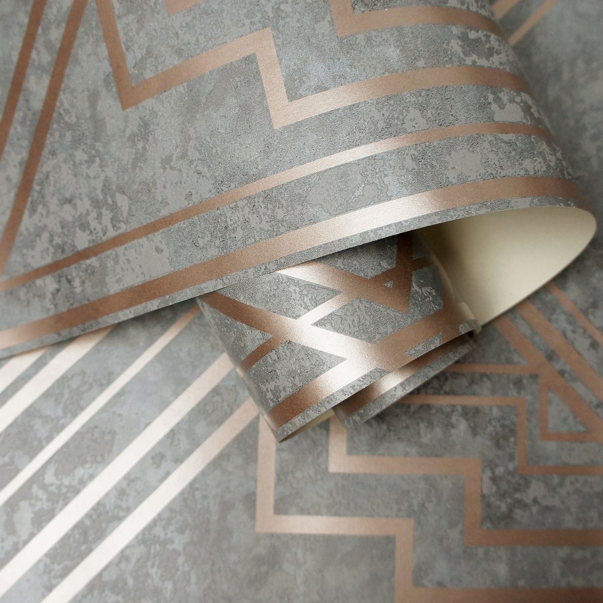 A stunning art deco geometric pattern in rose gold against an elegant grey industrial textured background, the stark contrast of this metallic wallpaper from the Obsidian Wallpaper Collection adds a striking dimension to your walls. The gorgeous Holden Decor Delano Geometric Grey/Rose Gold Metallic Wallpaper is an enchanting addition to your home. Add a touch of class to your home with the Holden Decor Delano Geometric Grey/Rose Gold Metallic Wallpaper, suitable for most rooms excluding kitchens and bathrooms.