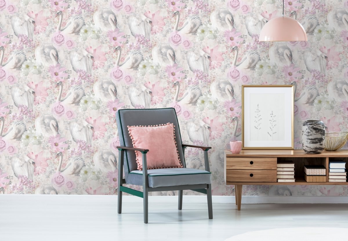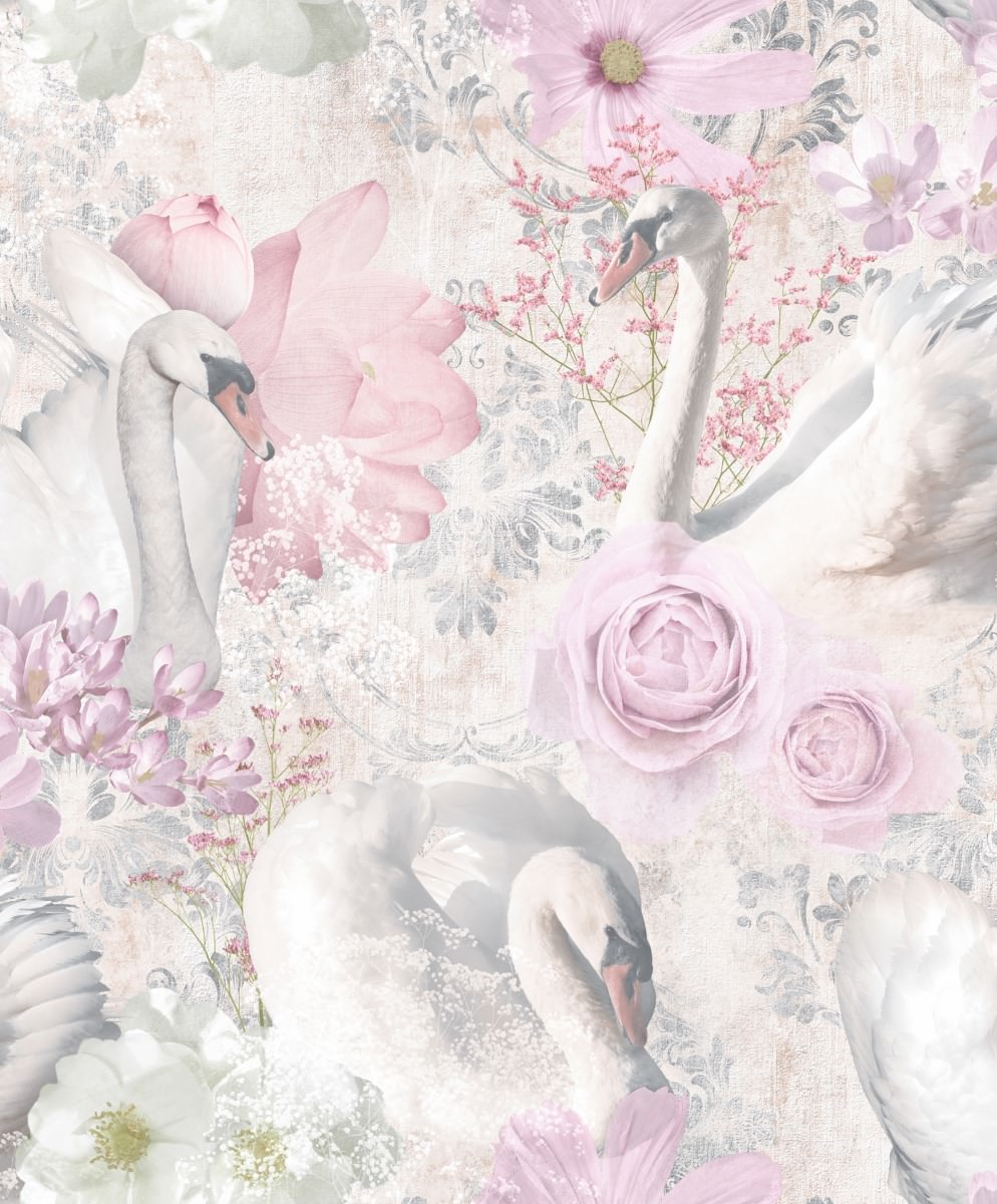 The wallpaper features the majestic swan alongside an elegant floral print.