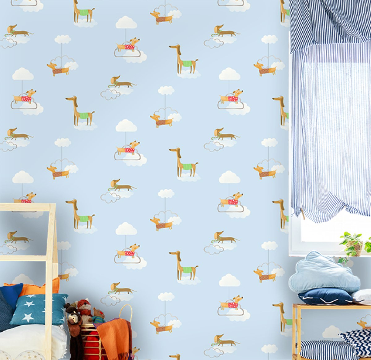 The wallpaper features a cartoon inspired design of different breeds of dogs and is comes in a whimsical design.