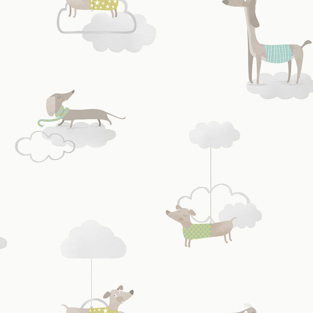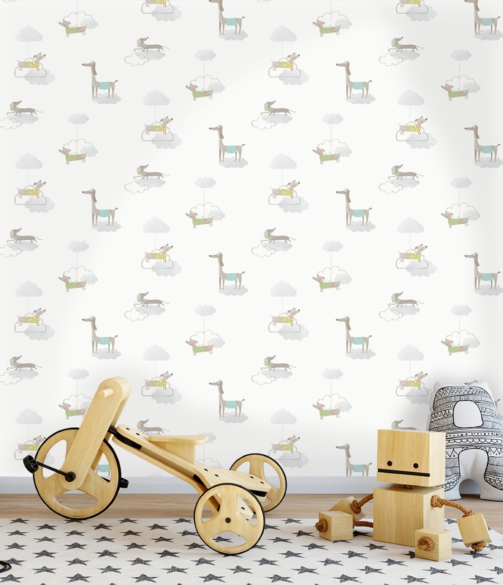 The wallpaper features a cartoon inspired design of different breeds of dogs and is comes in a whimsical design.