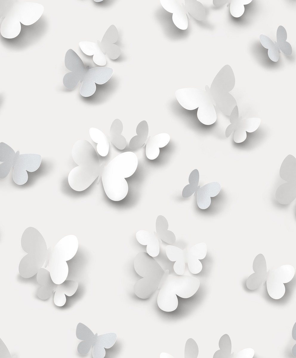 The simple but effective design features butterflies in a soft grey tone or highlighted in silver glitter, set on a white background with clever shading creating the 3D effect.