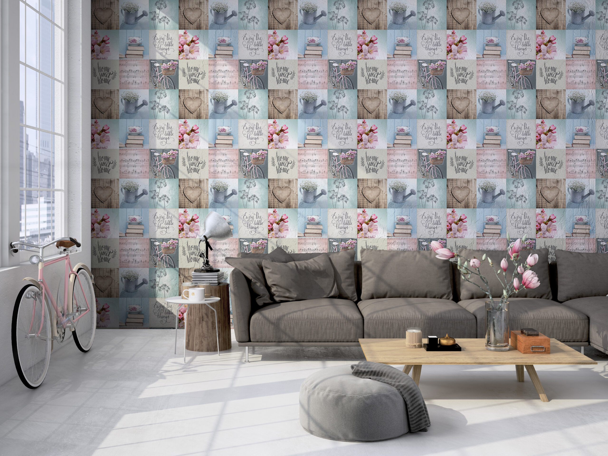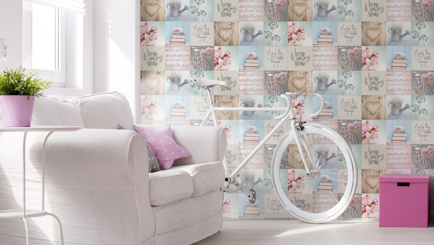 The wallpaper features a series of large squares, each of which is filled with pretty images from watering cans to flowers, and even sheet music.