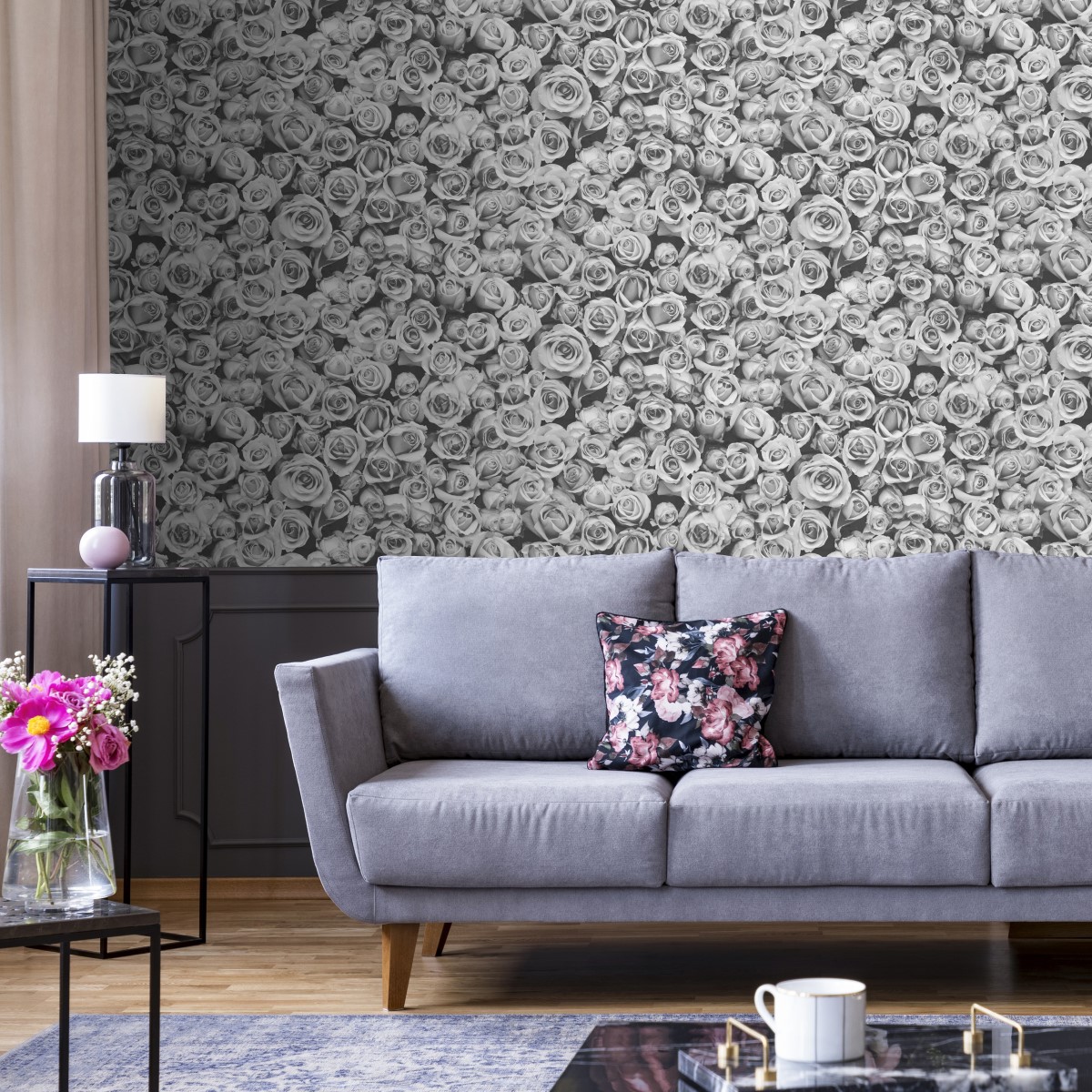 Use the Muriva Rosalee Floral Bloom Wallpaper as a feature wall and add pops of accessories for a splash of colour.