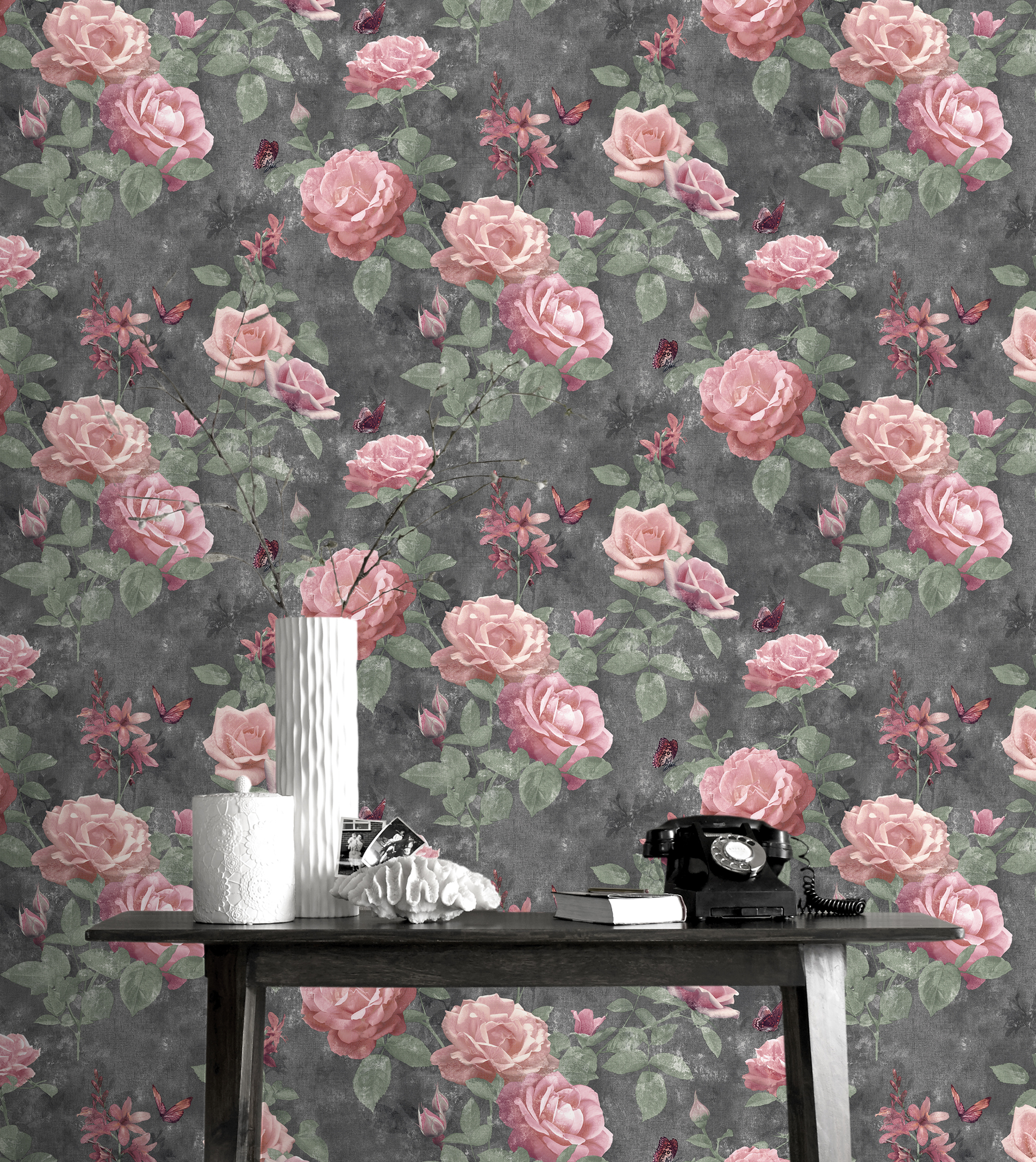 The wallpaper features a timeless floral print on a background with pops of roses.