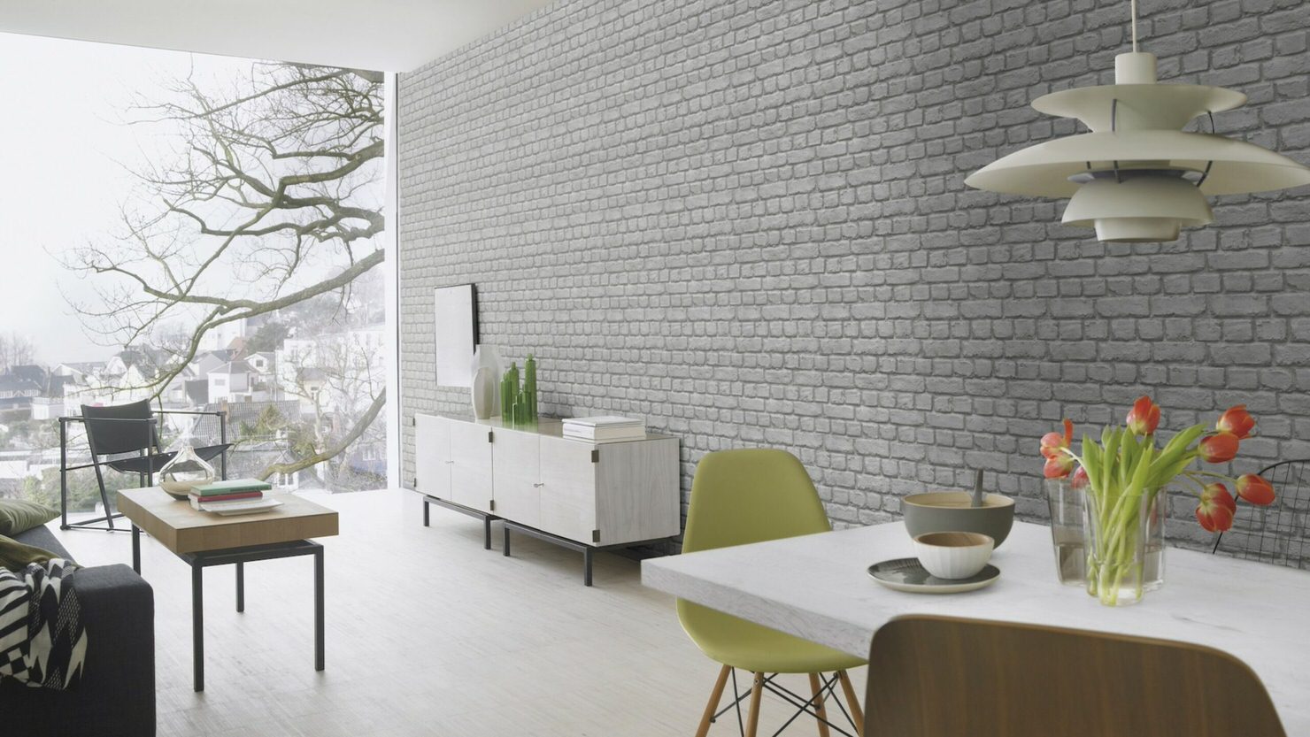 In a contemporary colour scheme, the Rasch Stone Effect Wallpaper blends rustic charm with modern styling.