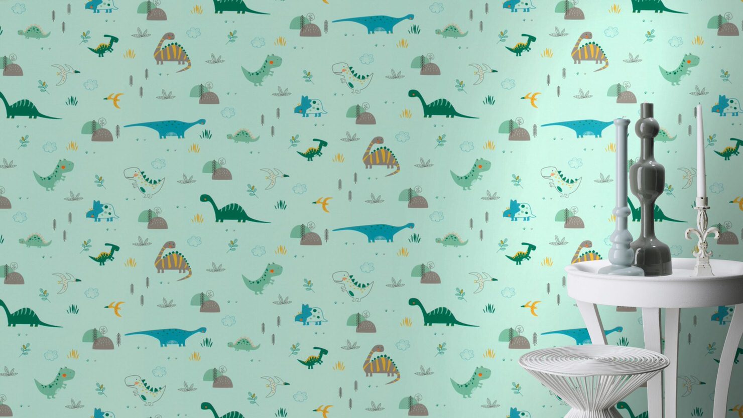 The wallpaper features a fun, dinosaur inspired print and is brought to life in a timeless colour scheme for a great look.
