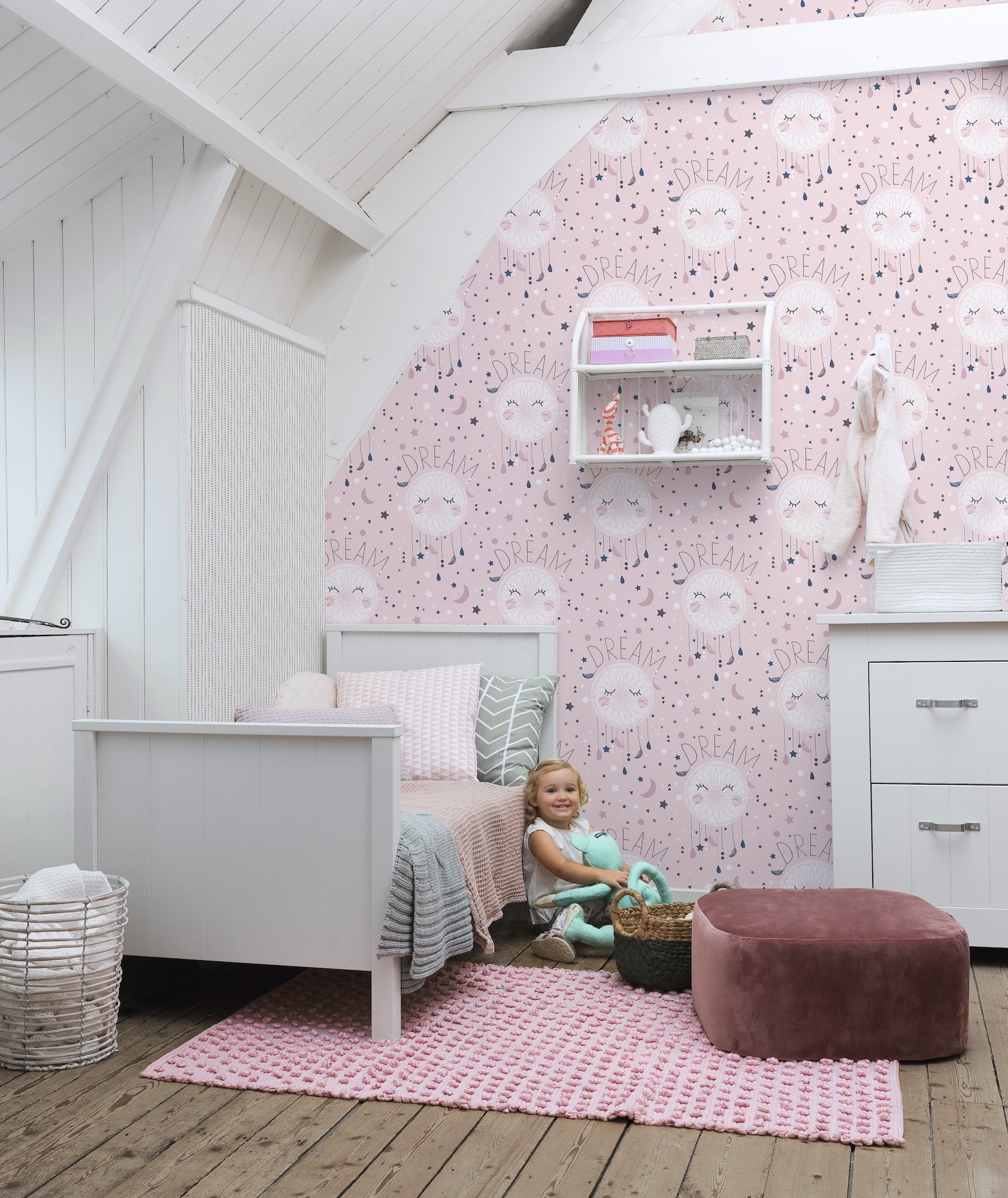 The Rasch Bambino Dreamcatchers and Stars Pink Multi Wallpaper can be used alone or teamed with the coordinating star wallpaper design from the same collection, or even one of the many plain designs.