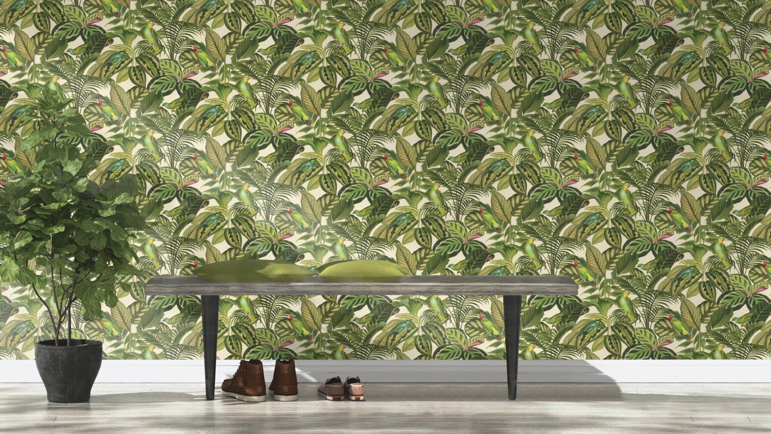The wallpaper has a tropical inspired feel and is brought to life with a large design incorporating lush vegetation and parrots.