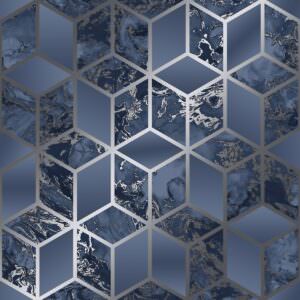 Muriva Elixir Cube Marble Blue & Silver Wallpaper 166512